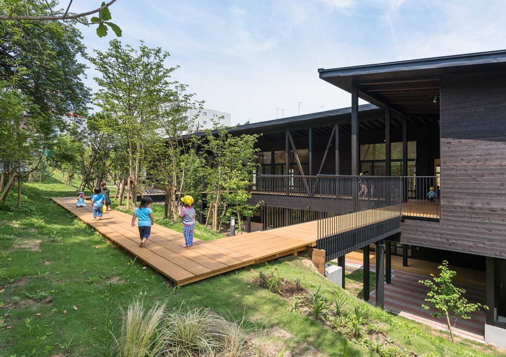 このように、既存の一見使いにくい敷地の高低差をうまく生かしたことにより、築山や斜面のある自然と建物が一体化した中を裸足で思いっきり遊べる環境が創造できたと思います。