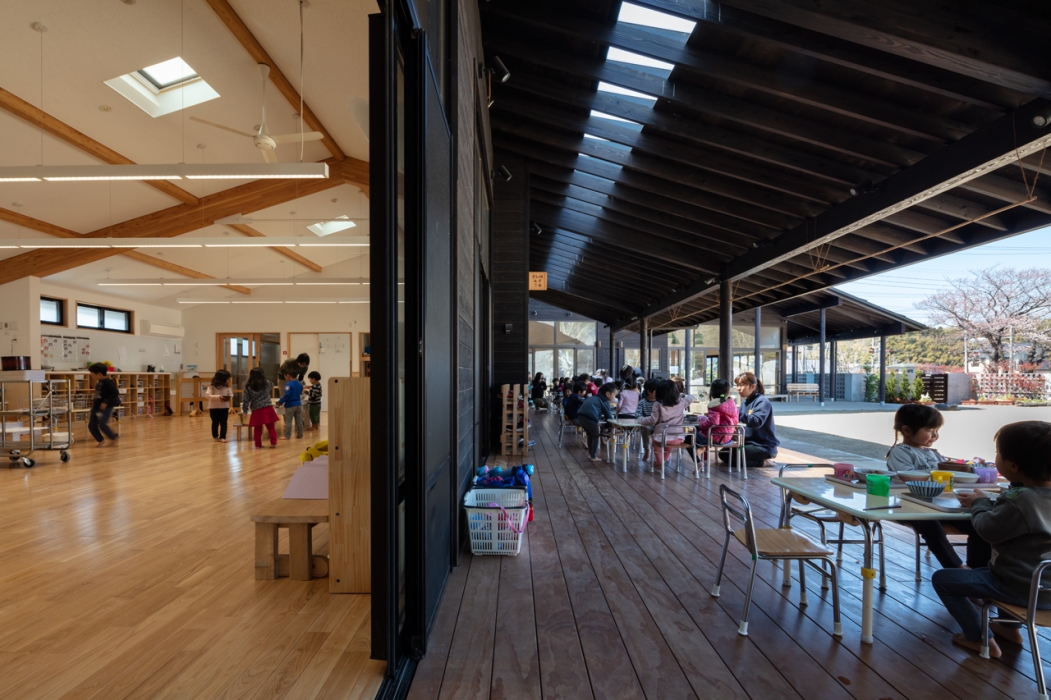 建替時に北側が園庭や縁側になったため、暗がりになりがちな縁側に直線状にトップライトを設けて一日中明るい半屋外スペースとなった。
