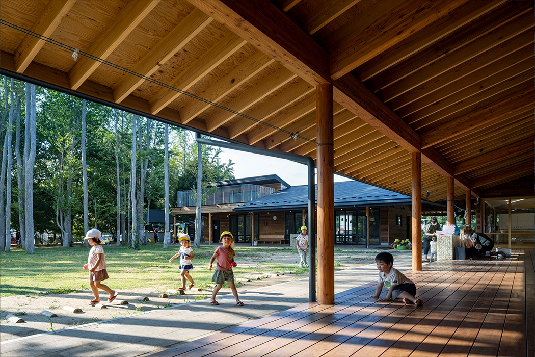 一面に高木の雑木林が残る土地を保育所用地として確保することができた。市街地化が進む地域で市役所から目と鼻の先にある貴重でかつ、広大な敷地である。できるだけ雑木林を残し、人工的な駐車場の間に園舎を配置して、森林の中に園舎が佇む最高の舞台が設置できた。園舎の園庭側は軒がL型に連なる半屋外の軒下空間とし、縁側やプール、日除けの場所としてとても気持ちがいい。これらの空間は、エントランス側へ抜け、歩道を歩く人々や地域からも見通せるように計画している。また、雑木林を利用してキャンプなどができるようにと炊事場として別棟を設けた。ここは日々森の中で暮らしているようなそんな保育環境となっている。