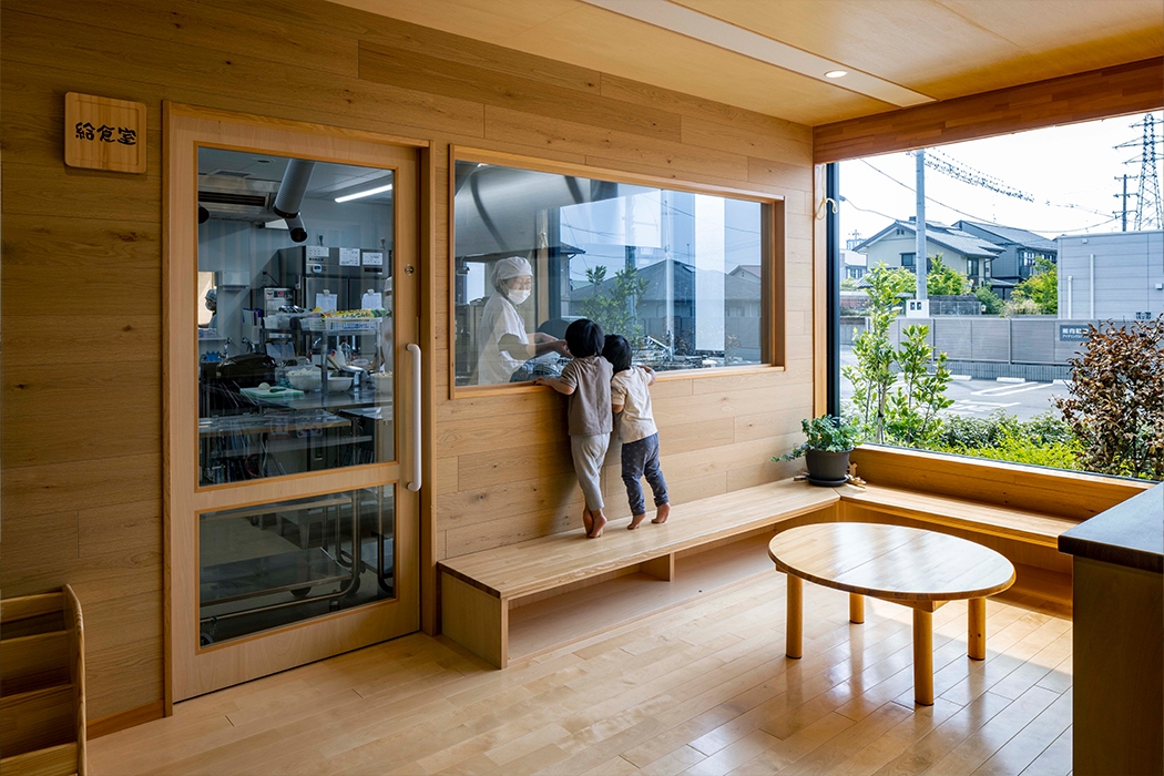 福島県、郡山駅から4、5kmにある、郡山市内の2園目の保育園。隣に大きな公園や畑が残る貴重な敷地で計画をおこなった。給食室がいつでも好きな時に覗けるようにガラス張りのコーナーを設けたり、広々とした園庭には様々な樹木を配置し、築山や畑などがあり、小動物やにわとりもいる。既成の遊具は無く、すべて園児や保育士、保護者の方々の手作り。焚き火をしたければ焚き火をすれば良し、木に登りたければ木に登ればよし、子どもの自然体験を重視した保育を行い、園庭や地域に開けた保育環境を提供している。