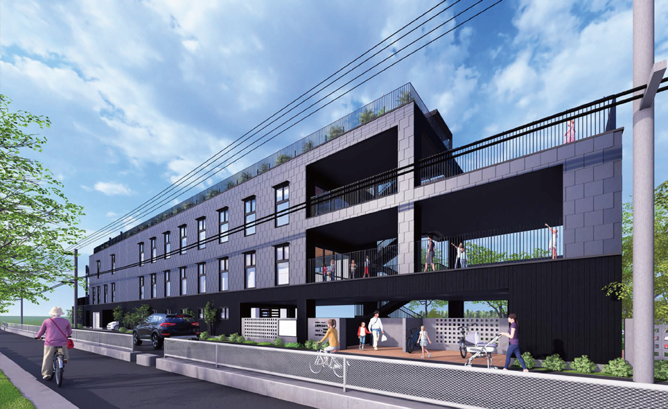 東西約75m×奥行5~19mの変形敷地に対し、立体的な配置計画を実施。各階に縁側(テラス)を設け、屋外階段で園庭から3階芝生広場まで縦につながる動線を確保。木調素材と金属鋼鈑を組み合わせた温かみある外観デザインを採用しました。